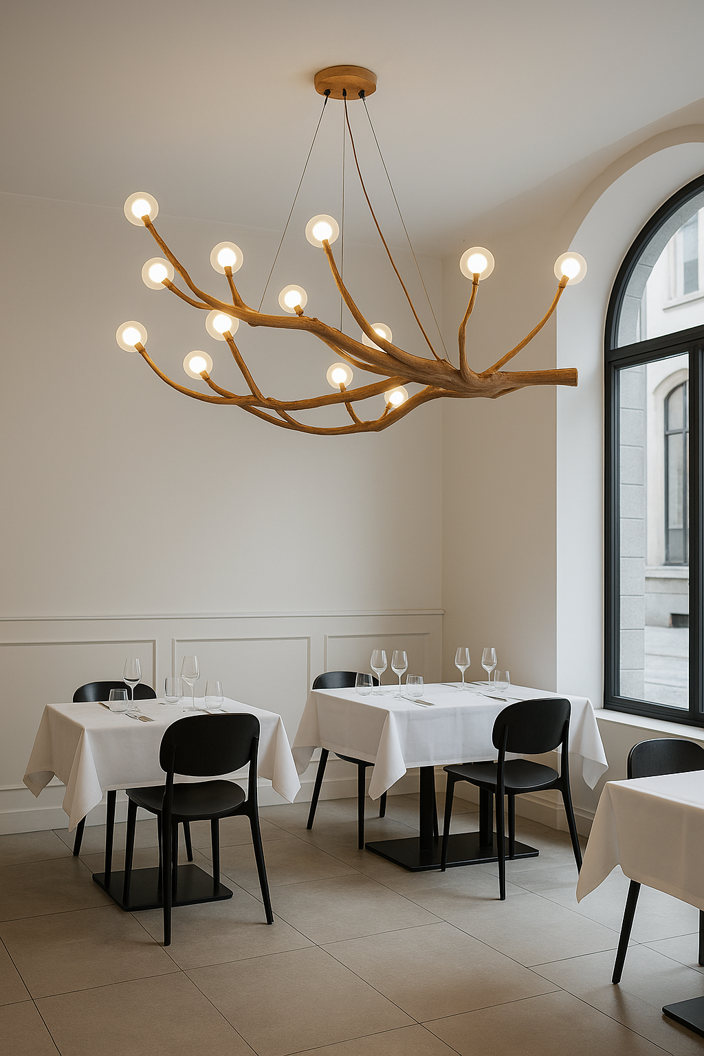 Disponible en plusieurs versions (16 ou 28 globes lumineux), ce lustre s’adapte parfaitement aux grands salons, salles à manger, halls d’hôtel ou restaurants haut de gamme. Son design sculptural en résine peinte allie solidité et esthétisme, offrant une ambiance chaleureuse aussi bien avec un éclairage blanc chaud qu’avec une lumière blanche froide.