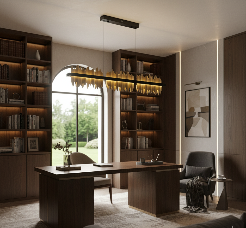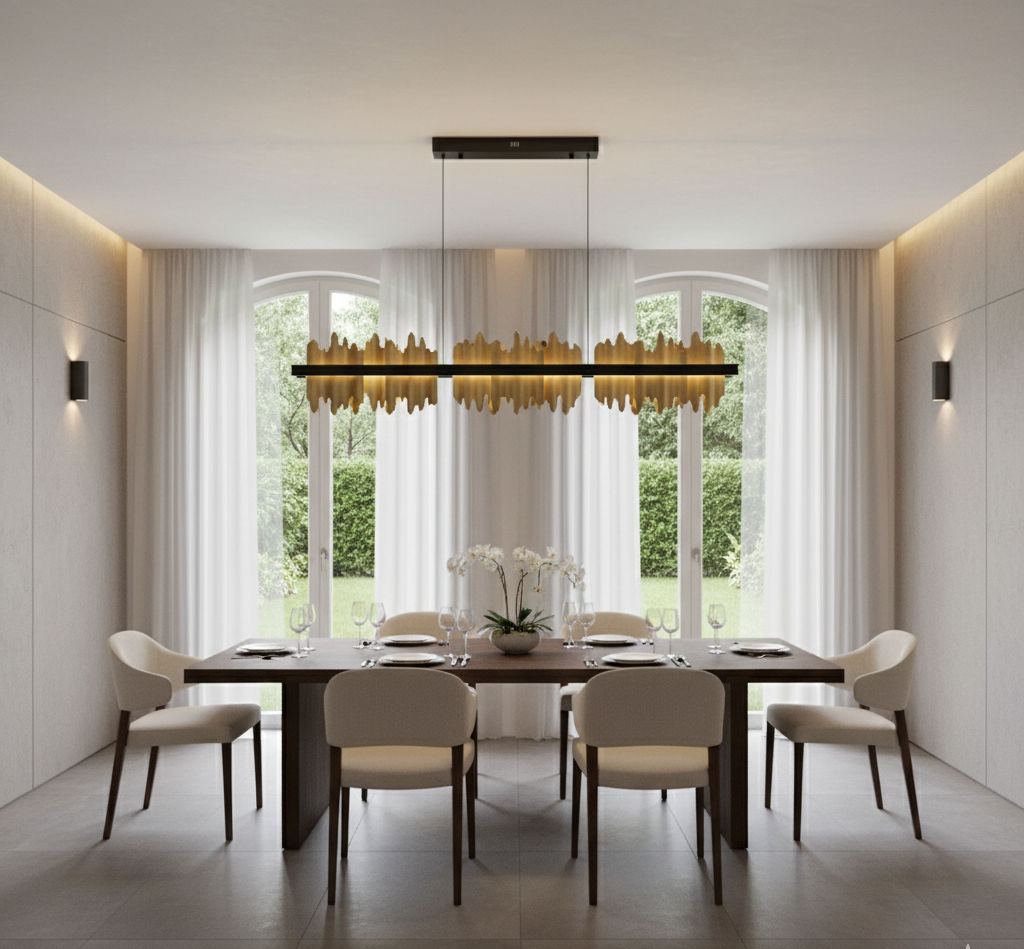 Sublimez votre espace avec le Lustre LED design Iceberg, une pièce sculpturale au caractère fort et élégant. Ce luminaire haut de gamme associe une structure dorée en acier inoxydable brossé à des éléments noirs en forme de cristaux, rappelant les lignes brutes des formations d’iceberg. Sa forme rectangulaire et allongée est idéale pour les grandes tables à manger, les îlots de cuisine ou les halls sophistiqués.