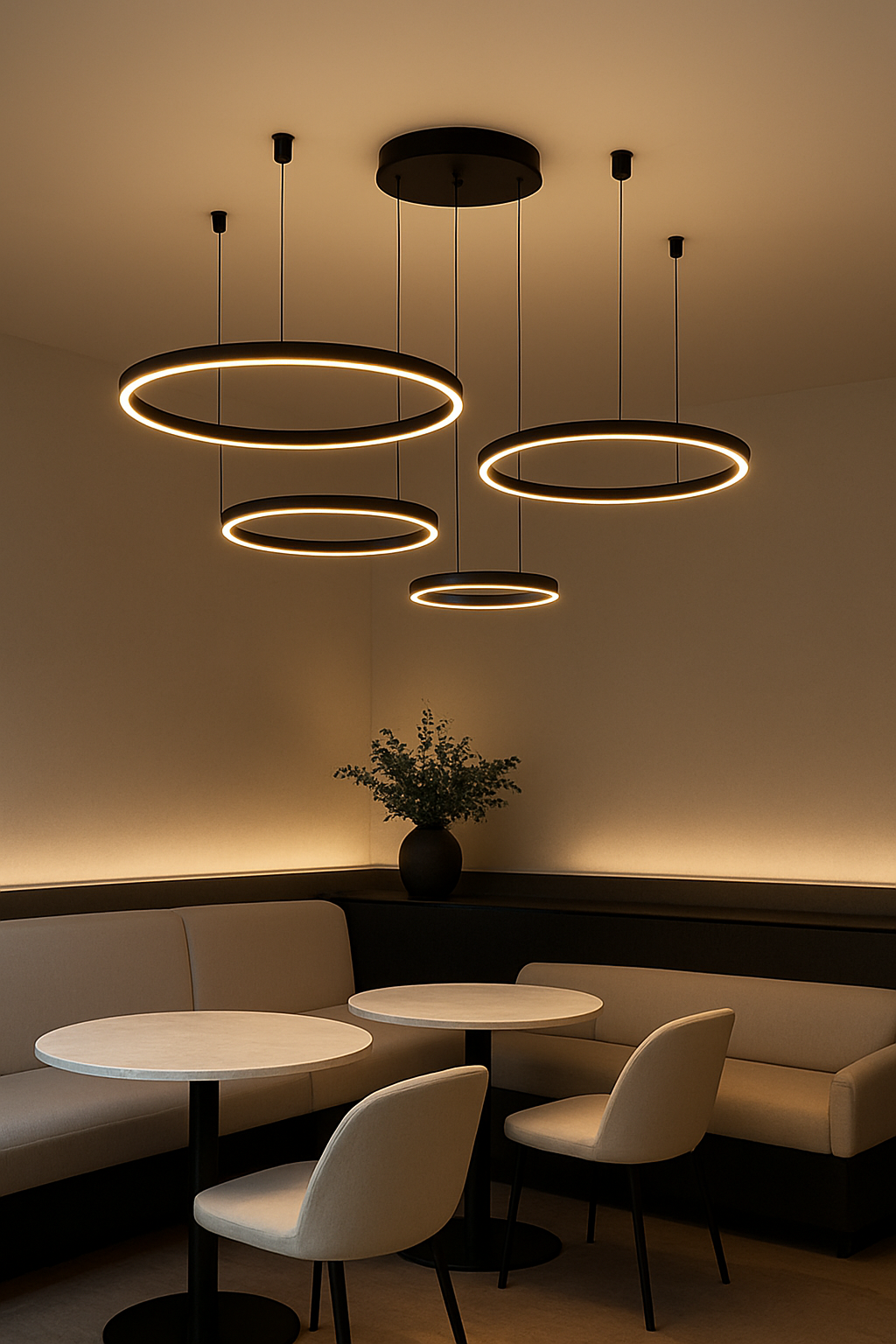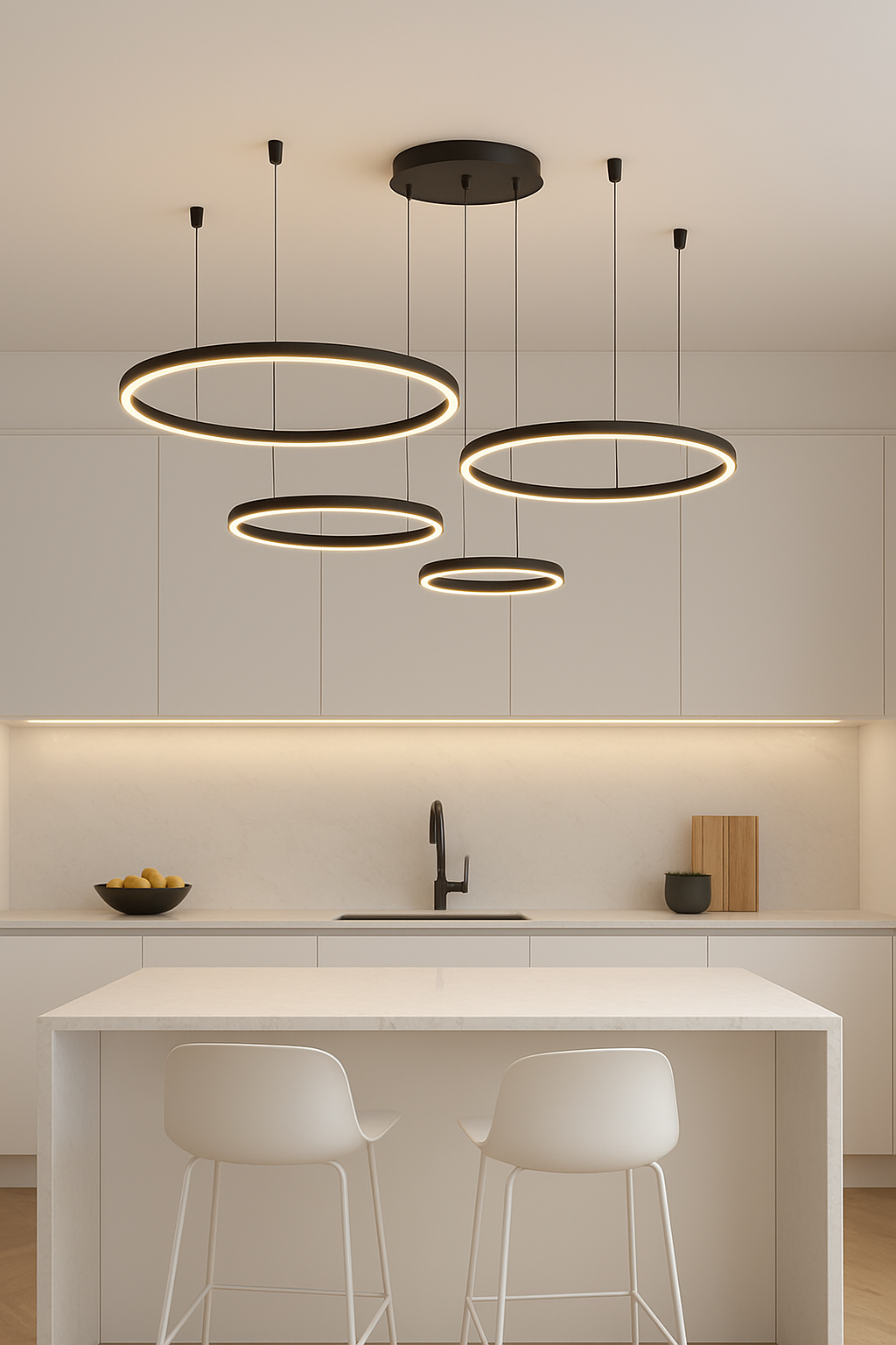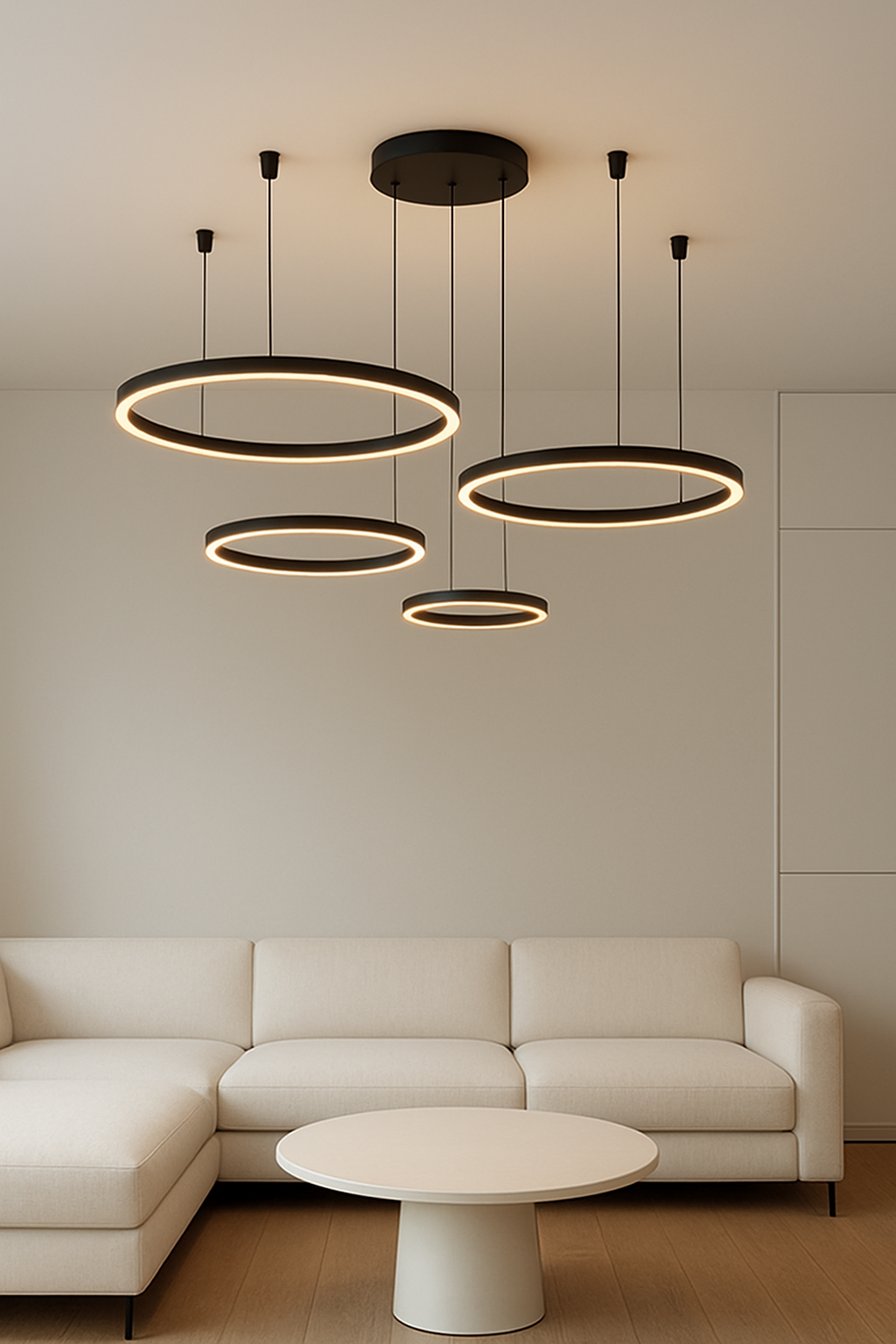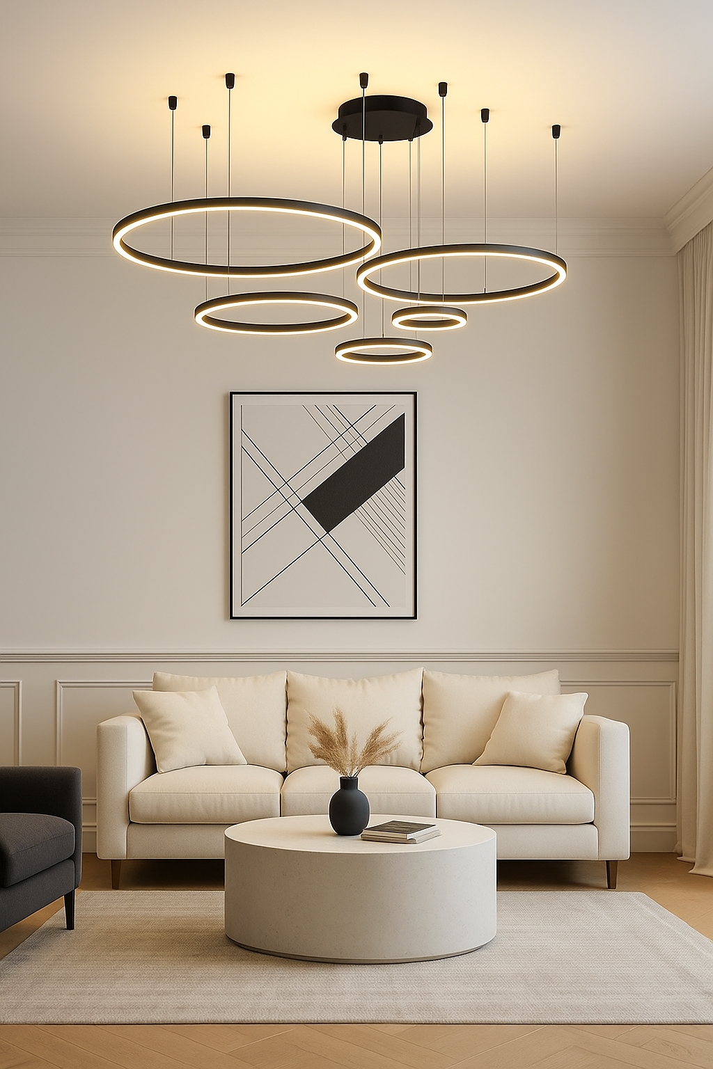 Conçu en aluminium brossé et fer de qualité, le lustre LED moderne anneaux suspendus se distingue par sa durabilité, sa légèreté et son style raffiné. Sa hauteur réglable et son installation simple en font un choix privilégié pour ceux qui recherchent un luminaire aussi pratique que spectaculaire.
