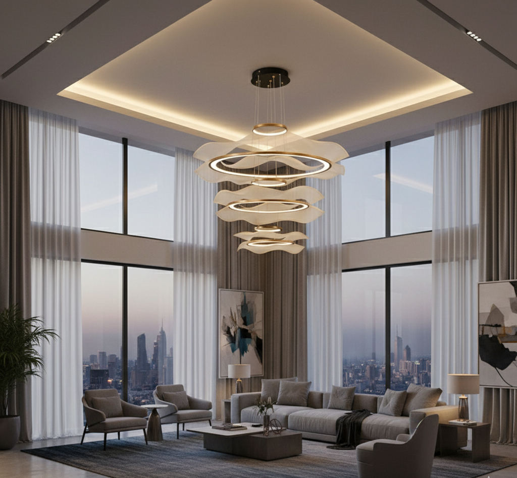 Apportez une touche contemporaine et raffinée à votre intérieur avec le lustre LED suspendu design ondulé. Ce luminaire sculptural se distingue par ses lignes fluides et aériennes, évoquant le mouvement de l’eau. Parfaitement adapté aux salons modernes, aux salles à manger élégantes ou aux suites d’hôtel haut de gamme, ce lustre LED suspendu design ondulé crée un jeu de lumière chaleureux et harmonieux. Sa conception en acrylique et fer plaqué assure une diffusion douce et homogène, idéale pour instaurer une ambiance apaisante.