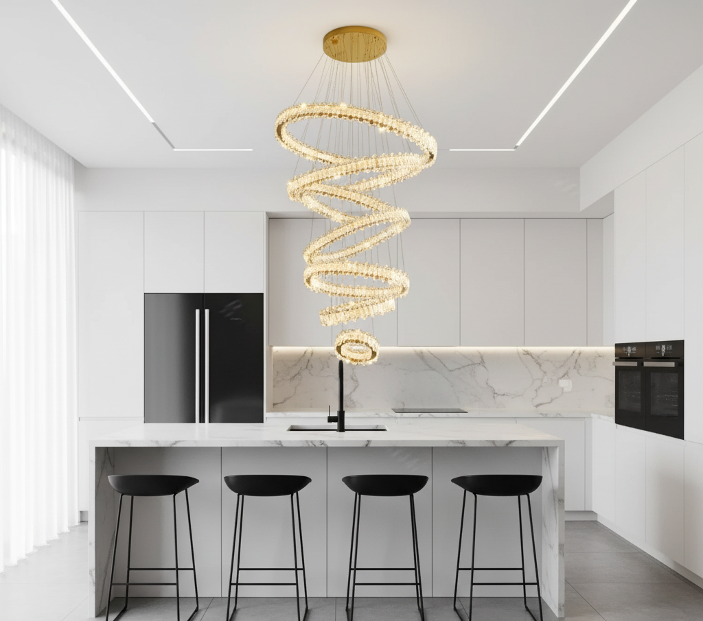 Le lustre moderne cristal spiralé est une véritable œuvre d’art lumineuse, pensée pour magnifier vos espaces à grands volumes. Ses anneaux sertis de cristal étincelant descendent en spirale, créant un effet visuel saisissant et raffiné. Conçu pour les intérieurs d’exception, il trouve sa place dans les escaliers majestueux, les salons cathédrales, les halls d’hôtels ou les villas contemporaines.