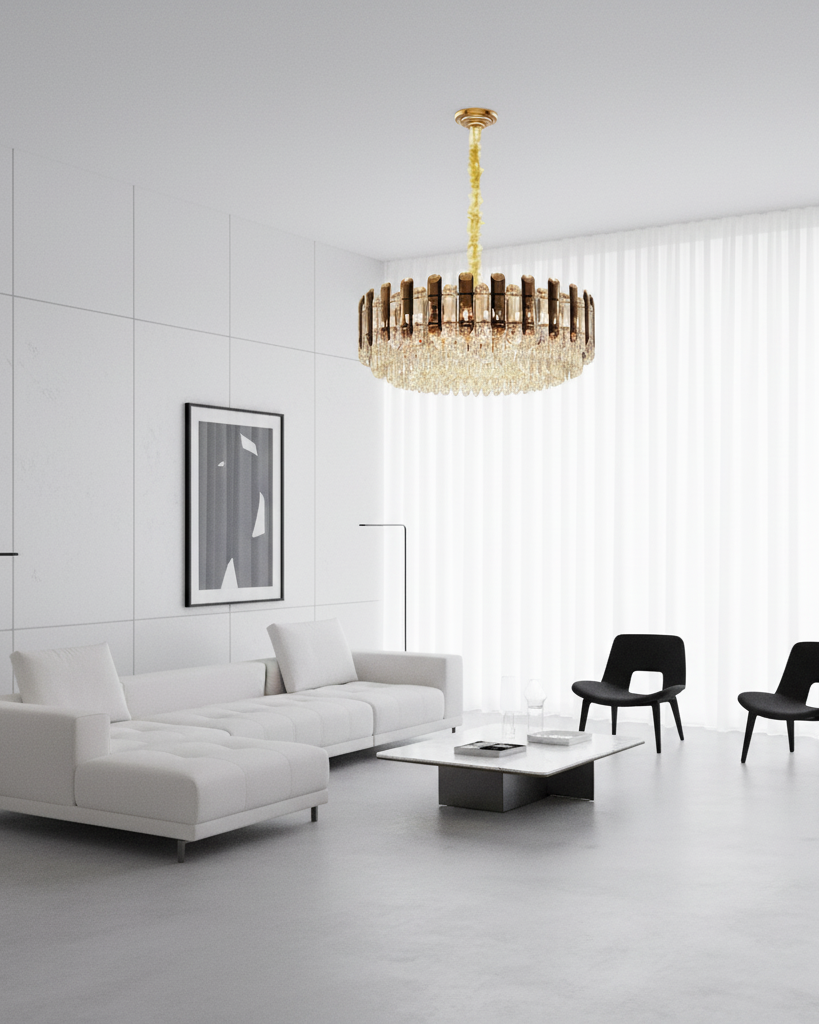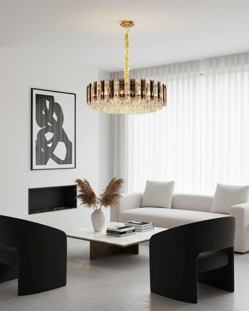 Disponible en trois tailles (40 cm, 60 cm et 80 cm), le lustre rond cristal fumé LED s’adapte à toutes les hauteurs de plafond grâce à sa chaîne ajustable. Son design circulaire orné de cristaux transparents et fumés reflète la lumière avec intensité, créant une atmosphère chaleureuse et prestigieuse.