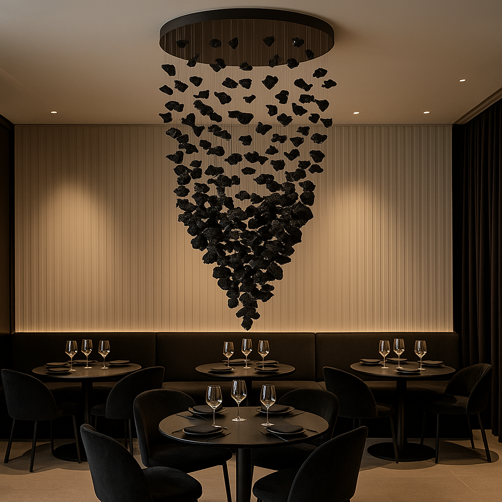 Avec son style moderne et sa finition minérale noire, le lustre suspendu artistique noir pierre s’adresse aux architectes, décorateurs d’intérieur, hôtels de standing ou particuliers exigeants.