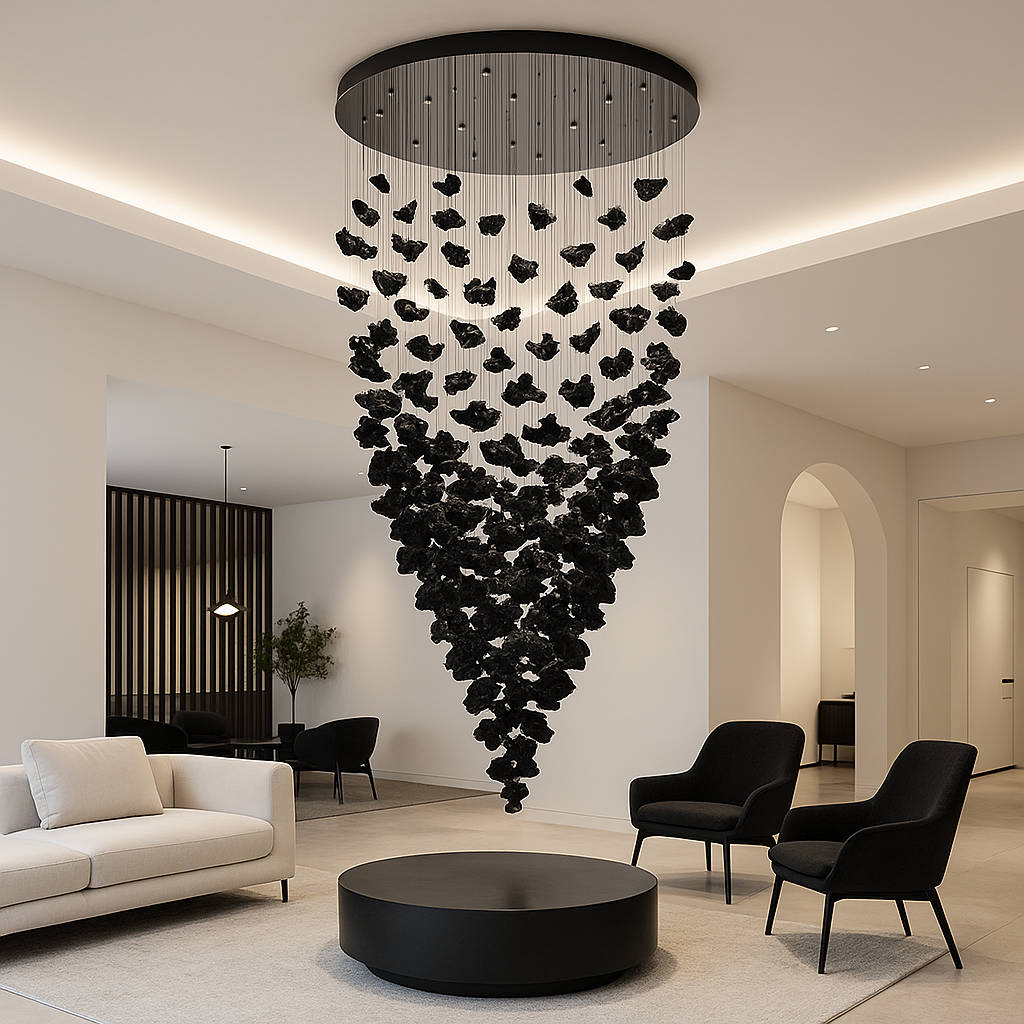 Le lustre suspendu artistique noir pierre transforme chaque espace en une œuvre architecturale remarquable. Composé de cristaux noirs évoquant des éclats de roche précieuse, ce luminaire moderne descend en cascade ou en cercle selon la variante choisie, créant un effet visuel spectaculaire. Parfait pour un hall d'hôtel, un grand escalier ou une villa au style contemporain, ce lustre est bien plus qu’un éclairage : c’est une pièce maîtresse qui capte tous les regards.